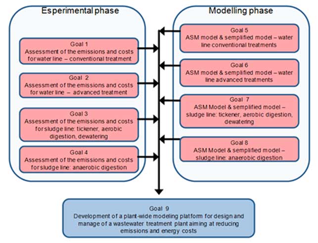 Aims: Both individual and synergistic contributions will characterize the two phases of the project (experimental and modeling) and their combination will allow us to achieve the aim and the final result of the project: development of an innovative mathematical platform for the design and management of WWTPs by reducing the environmental impact in terms of both energy costs and emissions. The quantification of emissions using a standardized measurement protocol and the technologies employed, which will lead to the development of a prototype tool, will also constitute one of the major aims and results of the project.